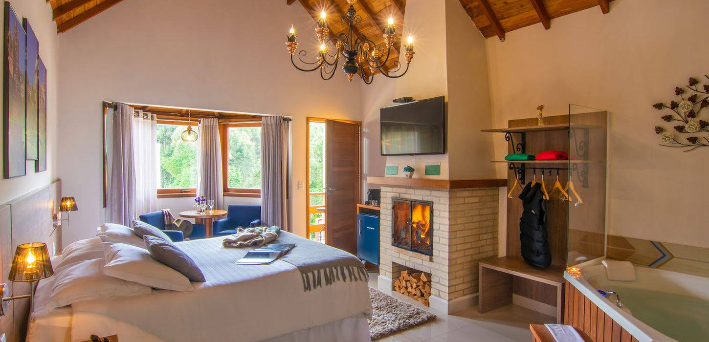 Um lugar perfeito para se entregar ao relaxamento e encanto. Desfrute de hidromassagem e do chuveiro duplo com luz azul para relaxamento, proporcionando momentos de tranquilidade e renovação. Além disso, essa suíte oferece uma sacada com vista privilegiada para as montanhas, que torna o cenário ainda mais encantador.